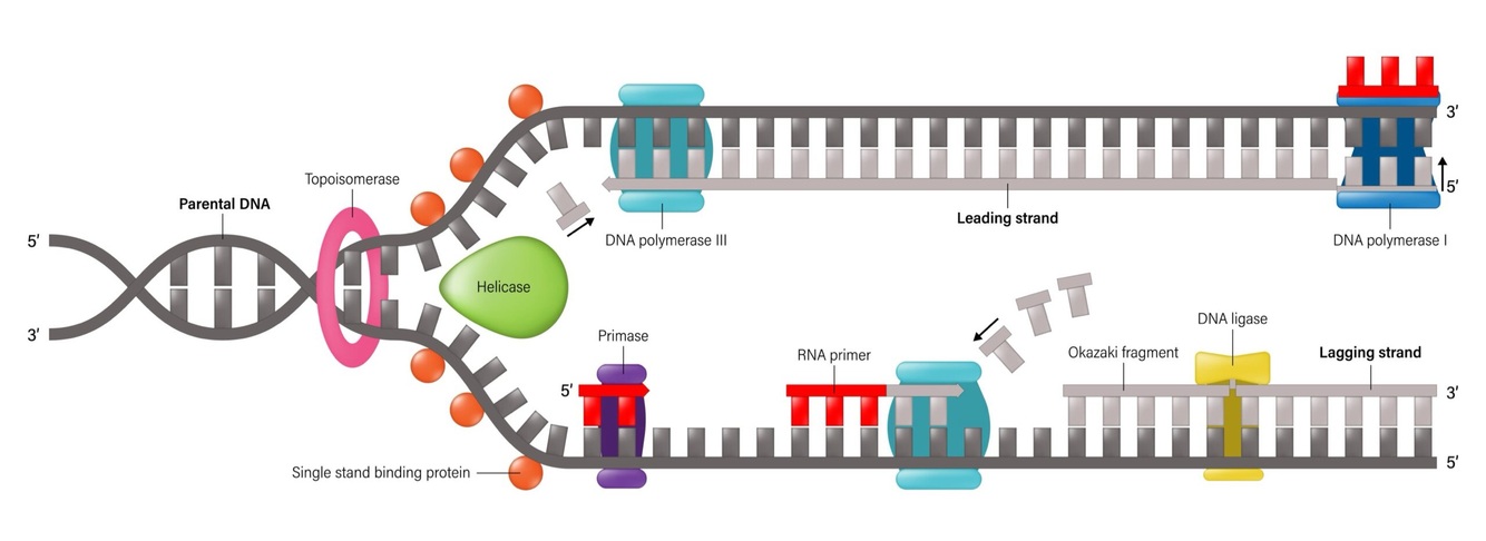 Leading strand: Starts at 3’ end of original strand, continuous, goes toward replication fork