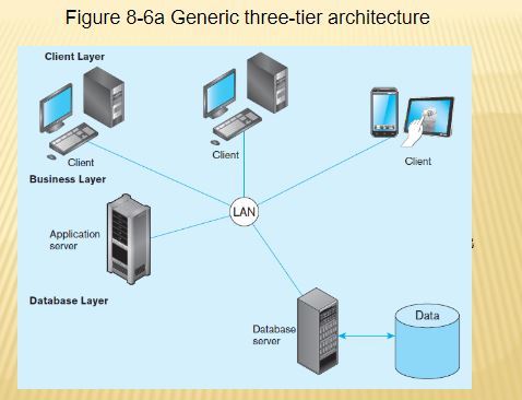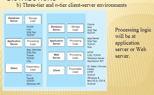 Where is the processing logic in a three-tier and n-tier client server environment?