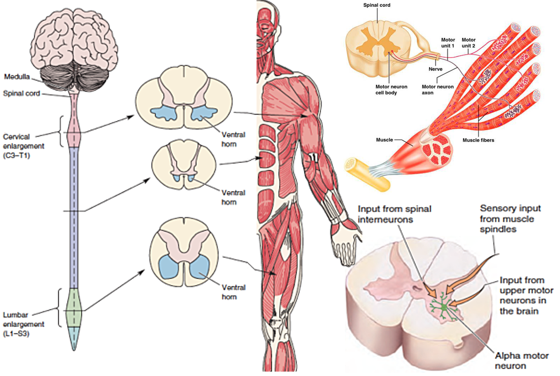 Alpha motor neurons are located within the gray matter of the ventral horn of the spinal cord and project their axons to muscles in the body. Their location in the spine correlates with the location of the muscles they innervate – e.g., neurons in the upper spine projecting to arms, and neurons in lower spine to legs.
