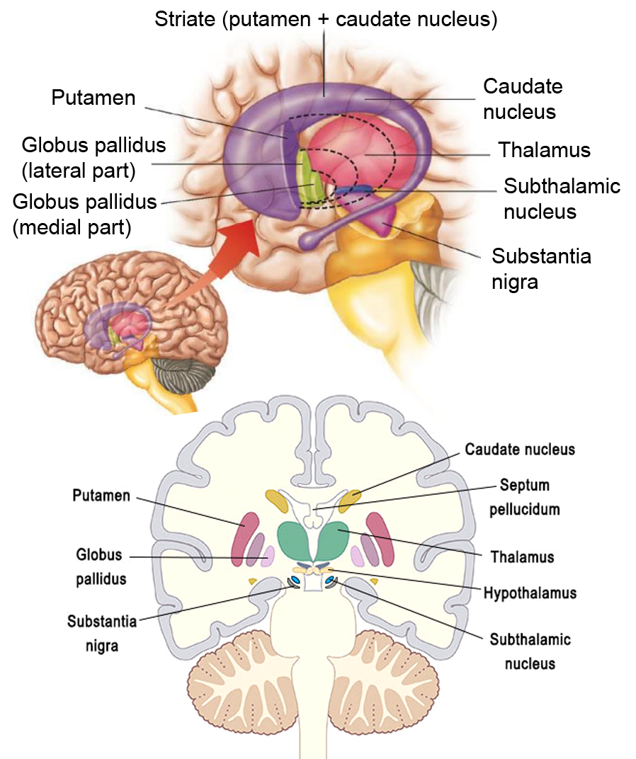 The several neurological conditions that are associated with basal ganglia dysfunction help outline the role of these structures. These include Parkinson’s disease (which involves a degeneration of dopamine-producing cells in the pars compacta of the substantia nigra) and Huntington’s disease (which primarily involves damage to the striatum), as well as Alzheimer’s, Tourette’s, OCD, and general addiction.