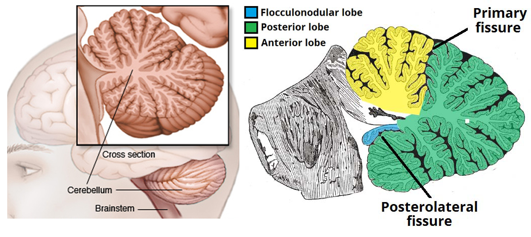 Book definition: “Also known as the ‘little cerebrum.’ A large, highly convoluted (infolded) structure located dorsal to the brainstem at the level of the pons. The cerebellum maintains (directly or indirectly) interconnectivity with widespread cortical, subcortical, brainstem, and spinal cord structures, and plays a role in various aspects of coordination ranging from locomotion to skilled, volitional movement. (p. 332)”