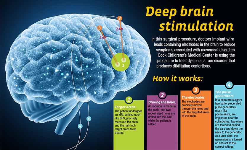 Book definition: “The electrical stimulation of brain structures via an implanted electrode. Stimulation of the subthalamic nucleus, one of the nuclei of the basal ganglia, is used as a treatment for Parkinson’s disease. (p. 362)”