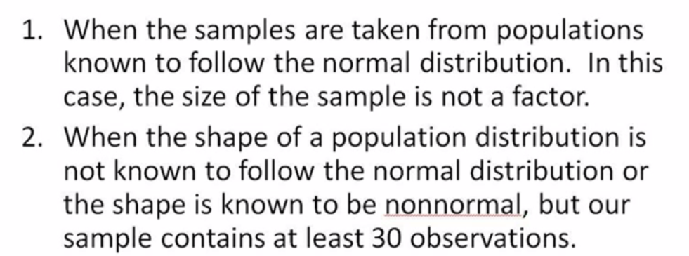 We know the sampling distribution of the sample mean will follow a normal probability under two conditions