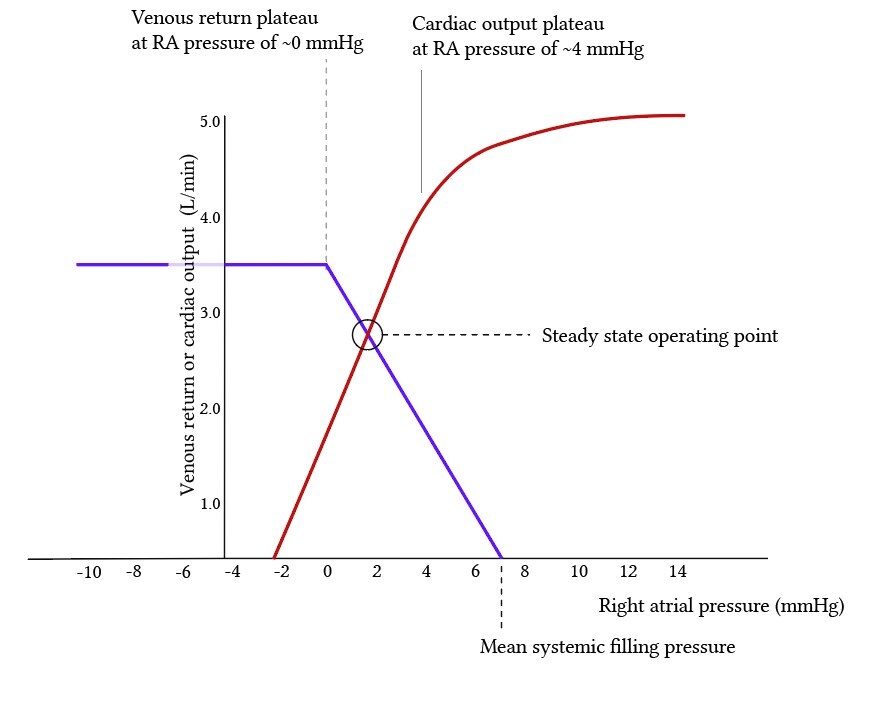 Explain why the venous function curve’s and the cardiac function curve’s intersection is the steady state operating point