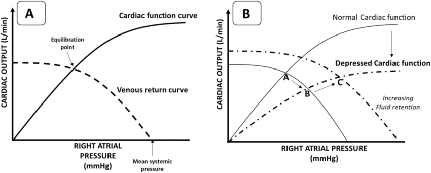 decreased cardiac function –> cardiac function curve falls down and to the right –> fluid accumulates (exacerbated by renal fluid retention from RAAS system)