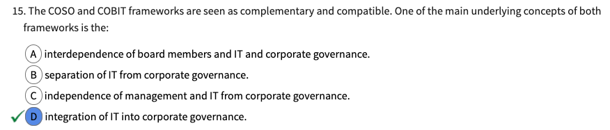 *a. Organisations use COSO and COBIT in tandem – COSO for their financial framework and COBIT for their IT control framework.