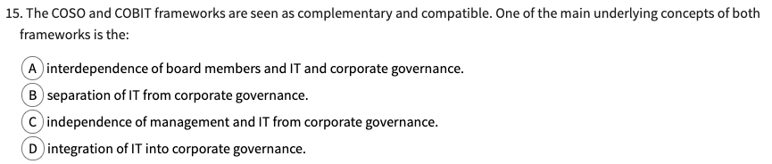 b. Organisations use COSO and COBIT in tandem – COSO for their IT control framework and COBIT for their financial framework.