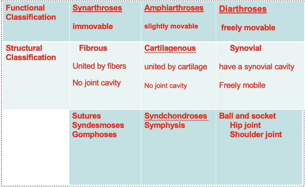 What are functional and structural classifications? Explain the functional (3) and structural (3) classifications of joints: and give one example of each
