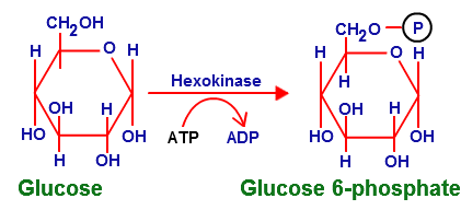 Step 1 (first investment step): glucose is converted to glucose-6-phosphate with the help of hexokinase which transfers a phosphate from ATP to the C6 position.