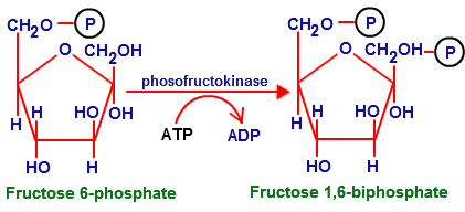 Step 3 (second investment step): fructose-6-phosphate is converted to fructose-1,6-diphosphate by a transferase, phosphofructokinase, which transfers a phosphate from ATP to the C1 position.