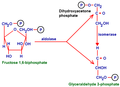 Step 4: fructose-1,6-diphosphate is cleaved by a lyase, aldolase between C3 and C4 to form dihydroxyacetonephosphate (DHAP) and glyceraldehyde 3-phosphate (G3P).