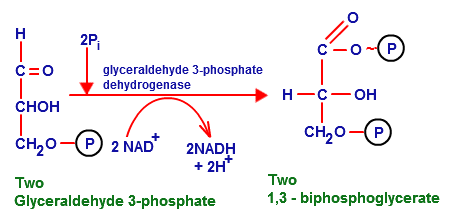 Step 6: glyceraldehyde-3-phosphate (G3P) is converted to 1,3-diphosphoglycerate (1,3-DPG) by glyceraldehyde-3-phosphate dehydrogenase, which uses NAD+ to oxidize the C1 position and adds a phosphate from Pi.