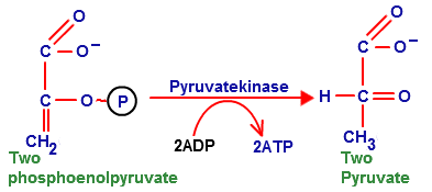 Step 10: phosphoenolpyruvate (PEP) is converted to pyruvate by pyruvate kinase, which transfers a phosphate group to ADP to form ATP.
