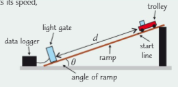 1. Set up apparatus as shown. Release trolley and it will accelerate down slope, easy to find s and t, but you need light gates to find velocity v