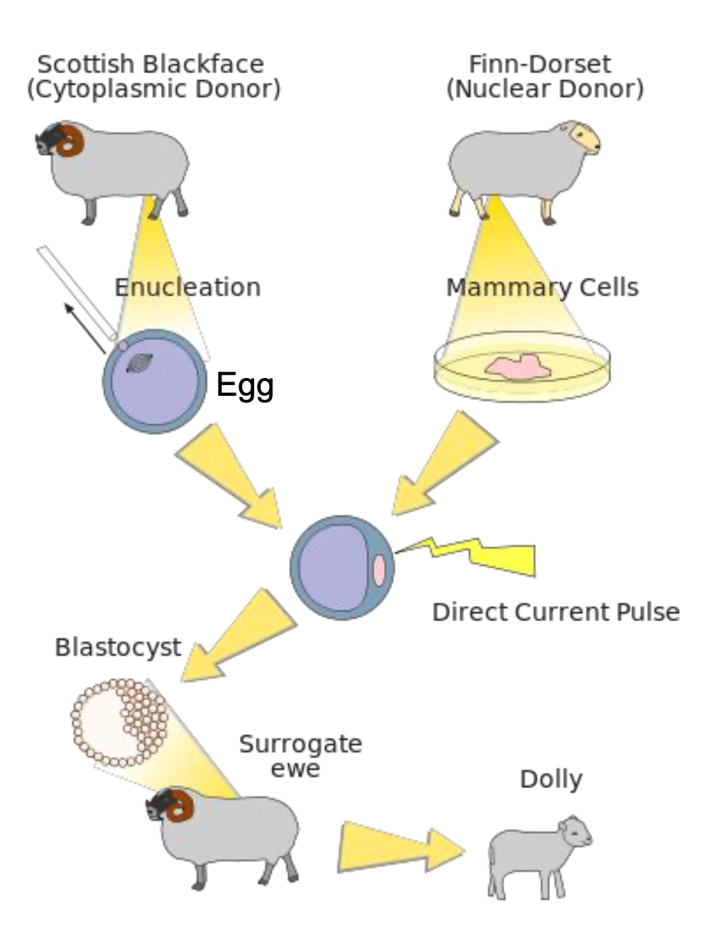 This was how Dolly was made, a cytoplasmic donor with enucleated cell/oocyte and a somatic nuclear donor cell is needed. After the cell and the DNA are ‘merged’, it is injected in a third animal that will carry the blastocyst.