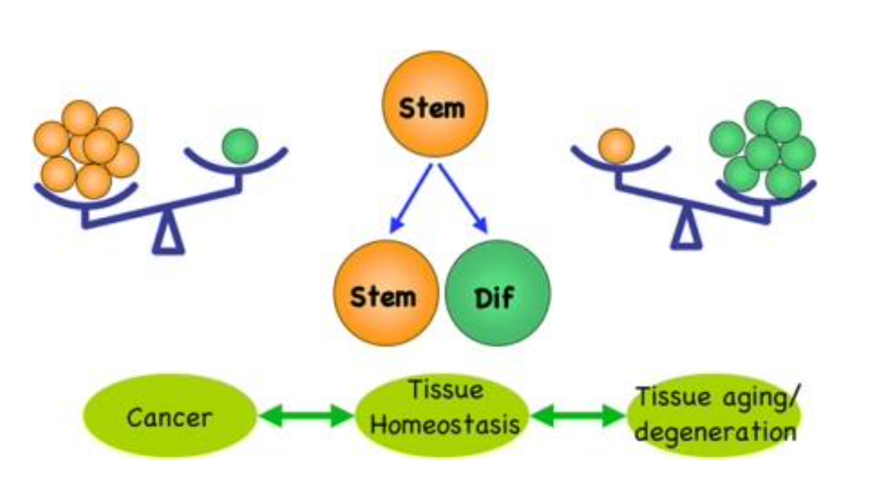 In the cell, there is a balance between self-renewal and differentiation. What happens when the cell is in balance?