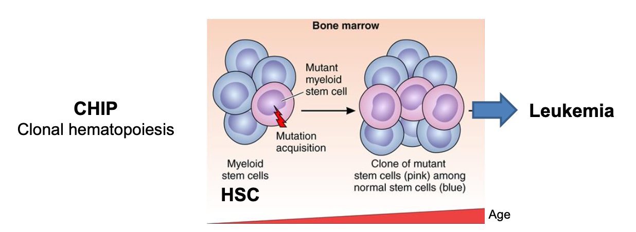 Clonal hematopoiesis (CHIP): aging related phenomenon in which hematopoietic stem cells (HSCs) contribute to the formation of a genetically distinct subpopulation of blood cells (example: acute and chronic myeloid leukemia)