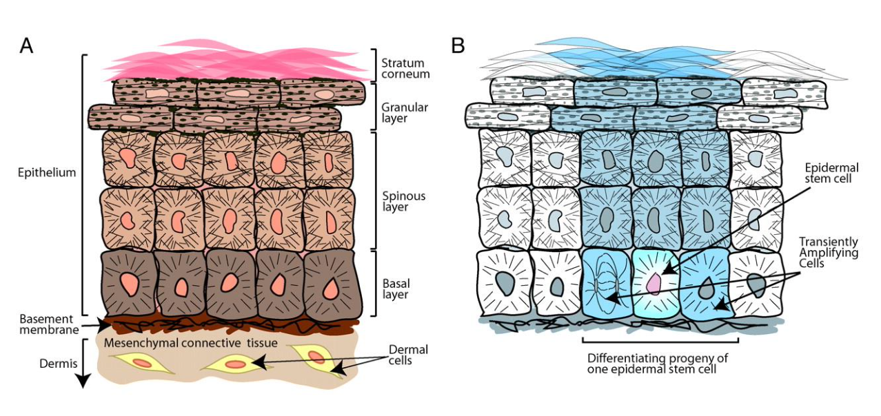 Figure: Diagrammatic representation of skin epithelial histology. Turnover rate of epithelial cells is 60 days