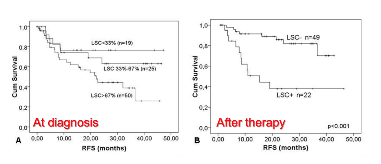 That the survival of AML patients decreases with increasing cancer stem cell frequencies (LSC = leukemic stem cells)