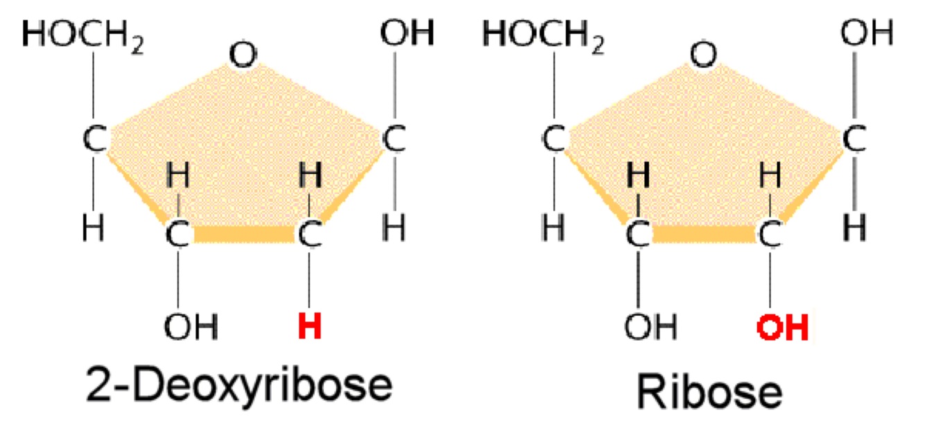 DNA: A, T, G, C, No OH group on 2’ carbon