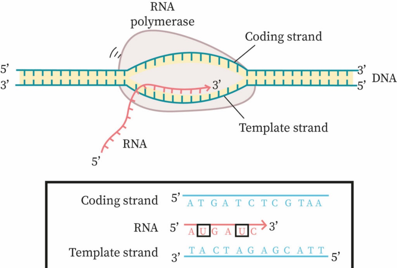 Coding strand: The other strand not being coded. Will be the exact same sequence (except will have T’s not U’s) and will also run in the same direction