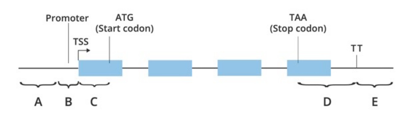 First there is the promoter, which tells RNA where to bind to DNA. Next, there is a transcription start site and finally a start codon. On the other side, there is a stop codon, transcription termination site.