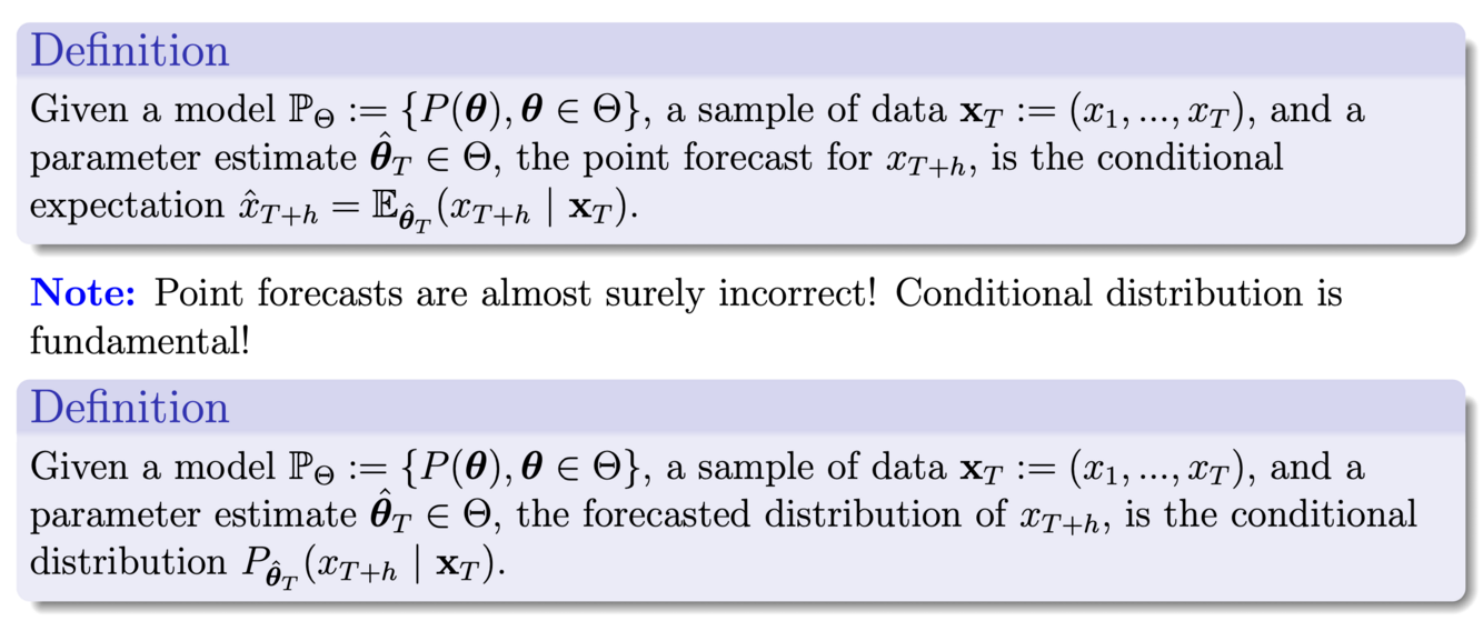 What is the definition of a point forecast and a forecasted distribution?