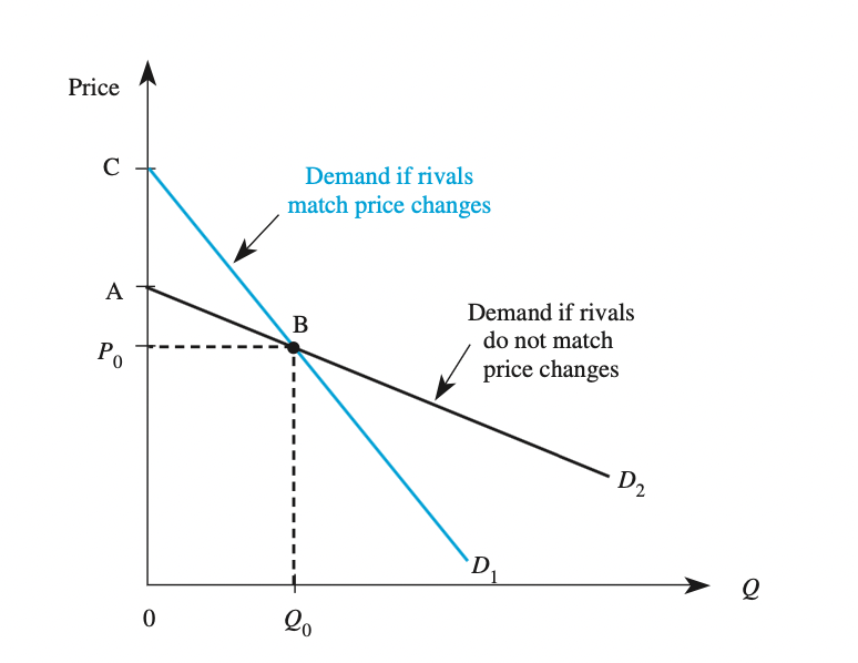 Demand curve D1 is based on the assumption that rivals will match any price change, while D2 is based on the assumption that they will not match a price change.
