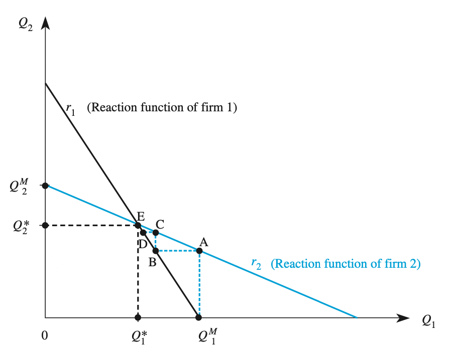 Given this reduced level of output by firm 1, point C will be the point on firm 2’s reaction function that maximizes profits. Given this new output by firm 2, firm 1 will again reduce output to point D on its reaction function.