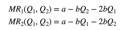 Then the marginal revenues of firms 1 and 2 are MR1(Q1, Q2) = a − bQ2 − 2bQ1, MR2(Q1, Q2) = a − bQ1 − 2bQ2