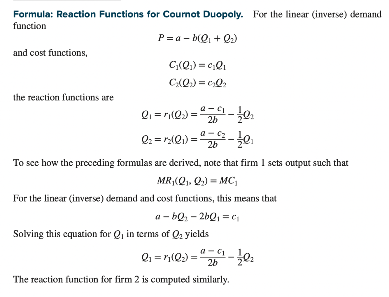 Similarly, by equating firm 2’s marginal revenue with marginal cost and per- forming some algebra, we obtain firm 2’s reaction function.