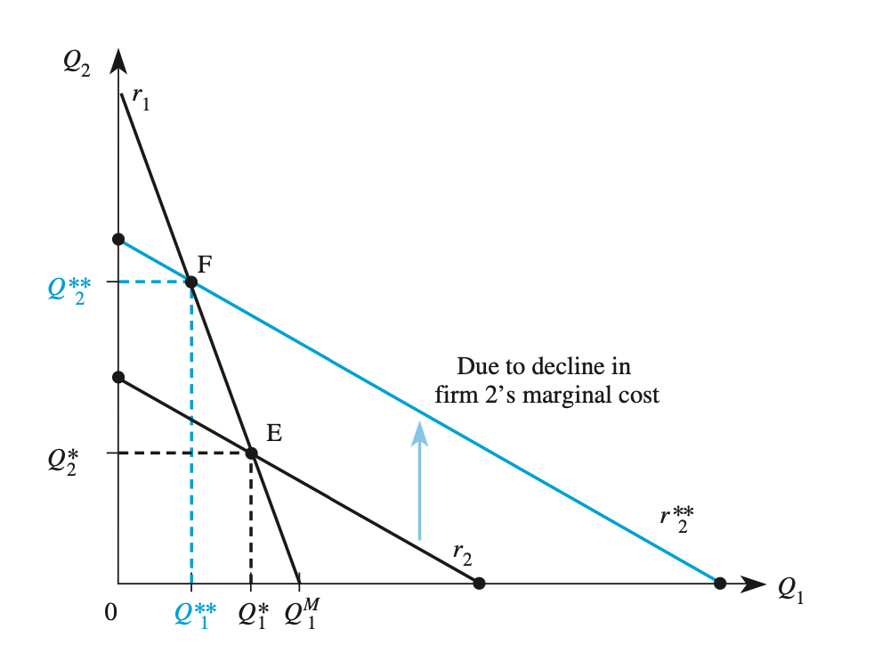 Graphically, this shifts firm 2’s reaction function up from r2 to r2, leading to a new Cournot equilibrium at point F. Thus, the reduction in firm 2’s marginal cost leads to an increase in firm 2’s output, from Q2 to Q2, and a decline in firm 1’s output from Q1 to Q1. Firm 2 enjoys a larger mar- ket share due to its improved cost situation.