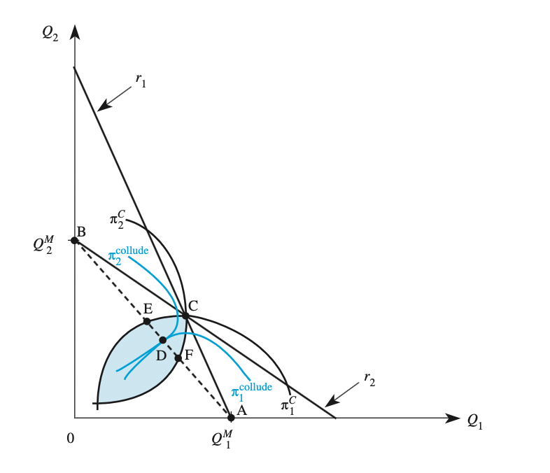 For example, at point D each firm produces less output and en- joys greater profits since each of the firms’ isoprofit curves at point D is closer to the respective monopoly point.