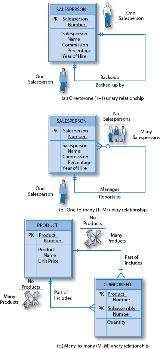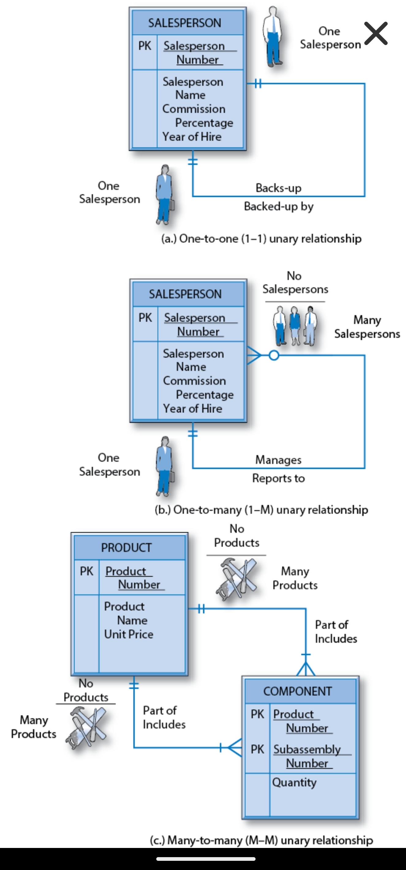 Unary relationships associate occurrences of an entity type with other occurrences of the same entity type.