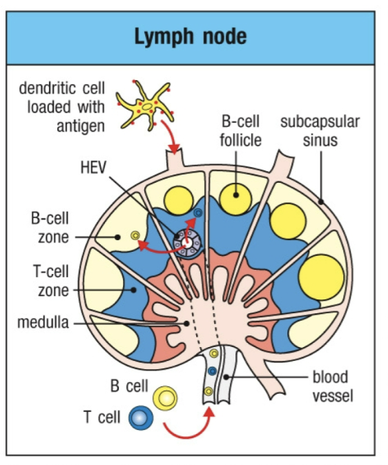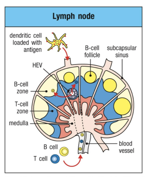 Once T cells reach a secondary lymphoid organ, they leave the bloodstream and migrate through lymphoid tissue, returning via……