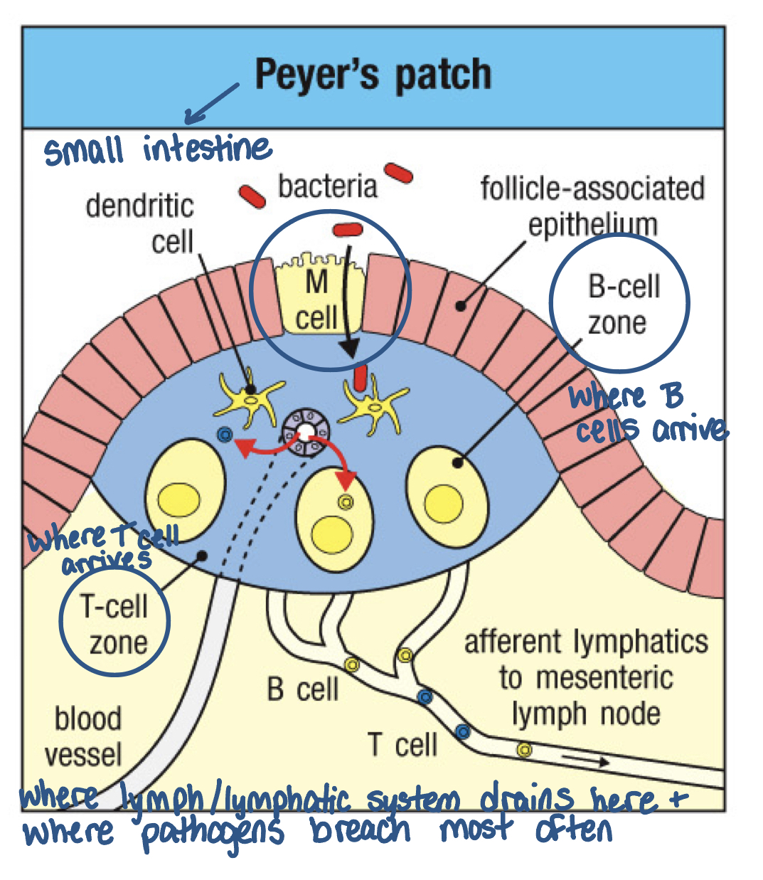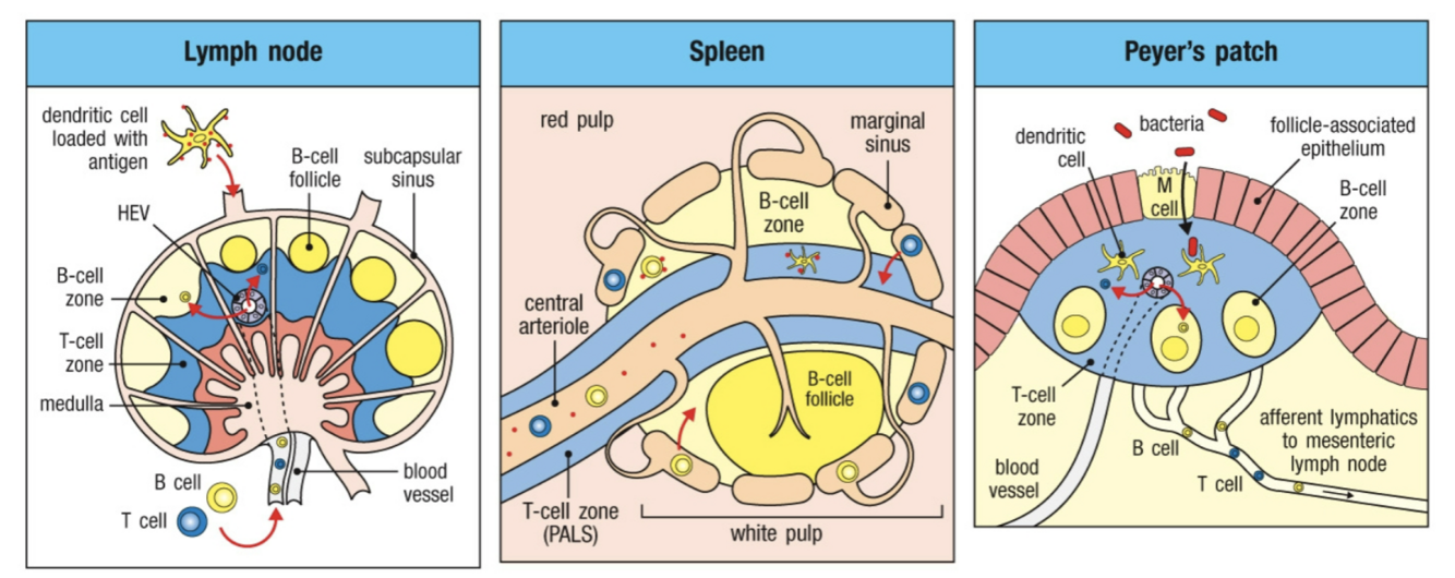 in the secondary lymphoid organs (spleen, lymph nodes, MALTs (Peyer’s patch in the gut)