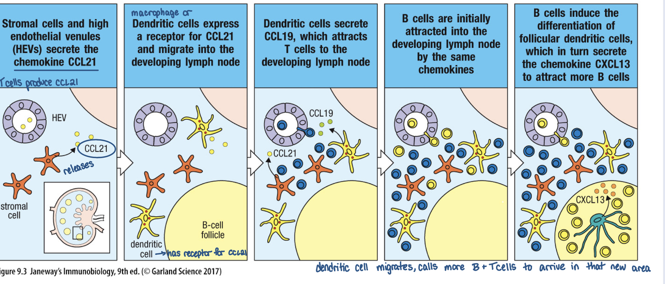 -dendritic cells secrete CCL19, which attracts T cells to the developing lymph node