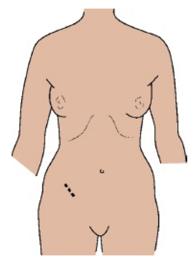Small, oblique right lower quadrant incision for an appendectomy through McBurney’s point (one third from the anterior superior iliac spine to the umbilicus):
