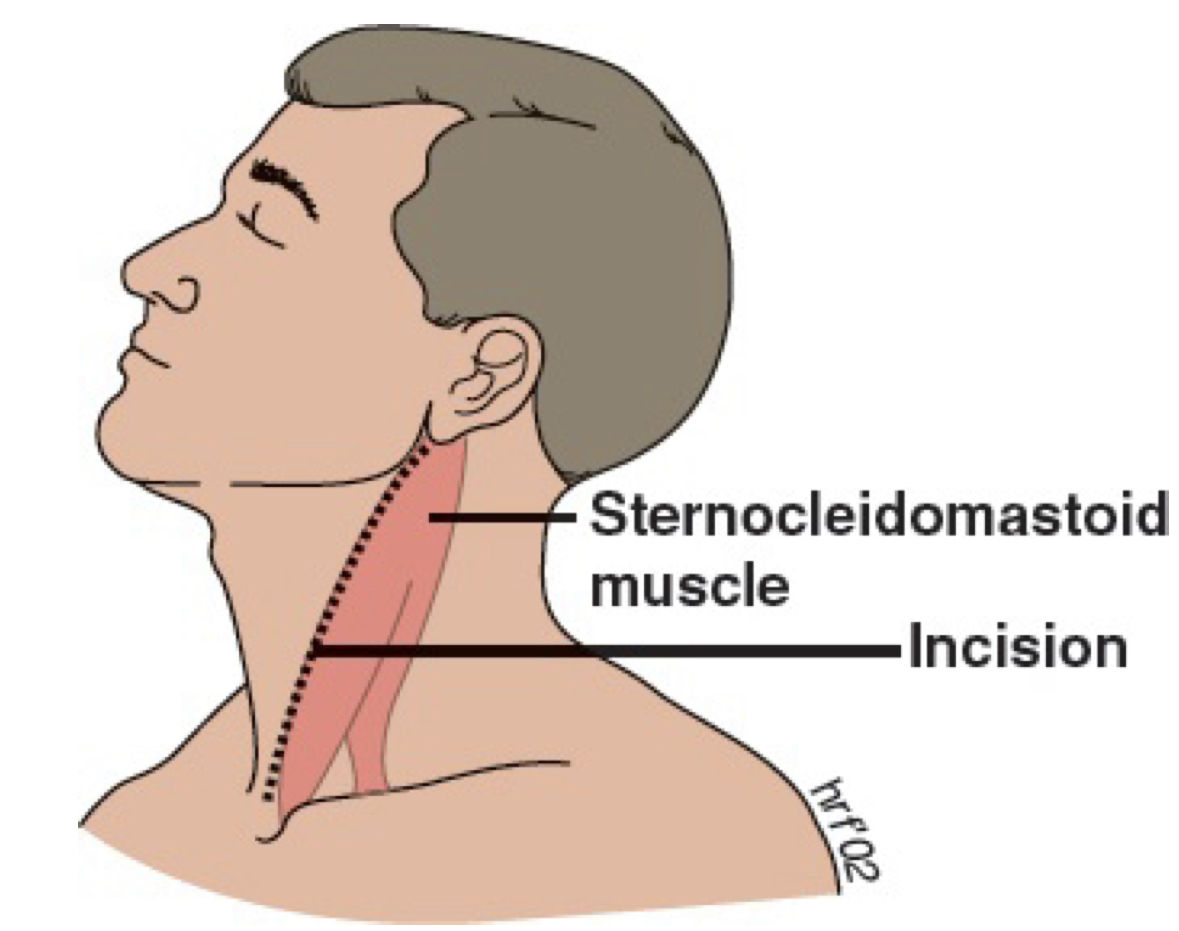 Incision down anterior border of the sternocleidomastoid muscle to expose thecarotid:
