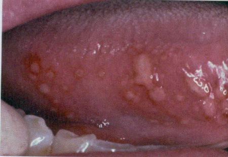 Herpetiform: 1-3mm