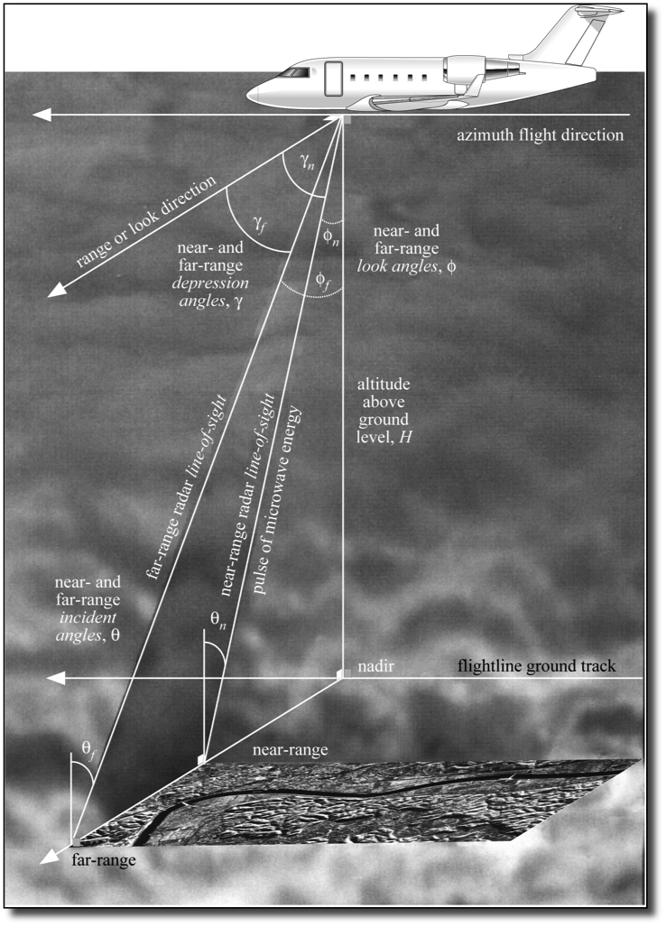 angle between the radar pulse of EMR and a line perpendicular to the earth’s surface where it makes contact. If the terrain is flat the incident angle the complement of the deppession angle. If the terrain is sloped there is no relationship between the two. Many radar studies assume the terrain is flat.