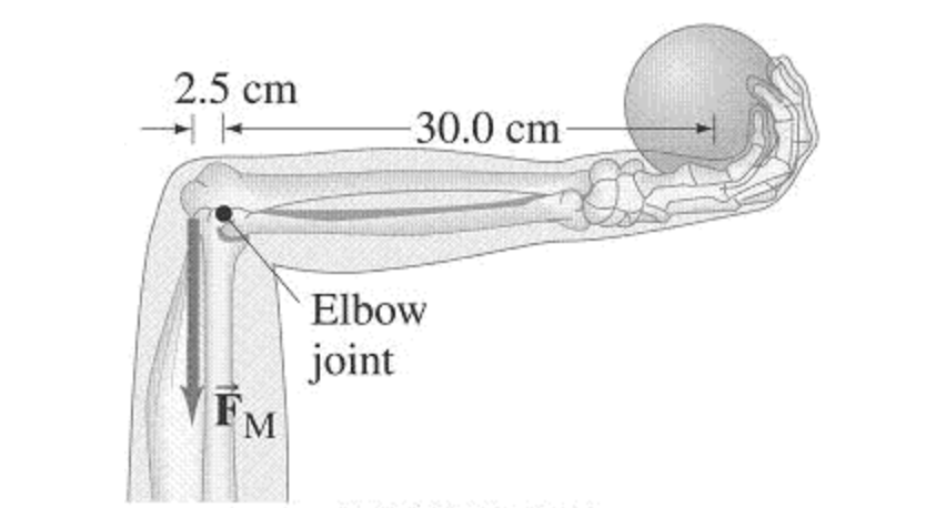 figure)? Assume the lower arm has a mass of 2.3 kg and its CM is 12.0 cm from the elbow-joint pivot.