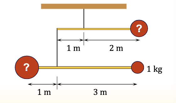A mobile hangs in static equilibrium (as shown below). The rods are massless and have lengths as indicated. The mass of the ball at the bottom right is 1 kg. What is the total mass of the mobile?