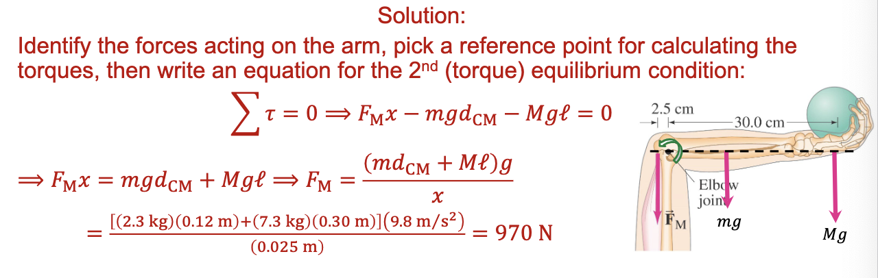 Assuming the lower arm has a mass of 2.8 kg and its CG is 12 cm from the elbow-joint pivot, how much force must the extensor muscle in the upper arm exert on the lower arm to hold a 7.5 kg shot put? (See the figure above.)