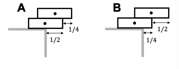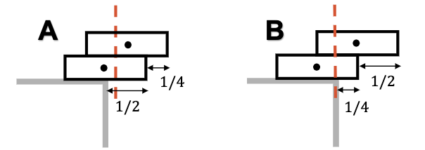 Consider the two configurations of identical books (shown below). The CM of each book is indicated by a black dot. Which configuration of books will tip over?