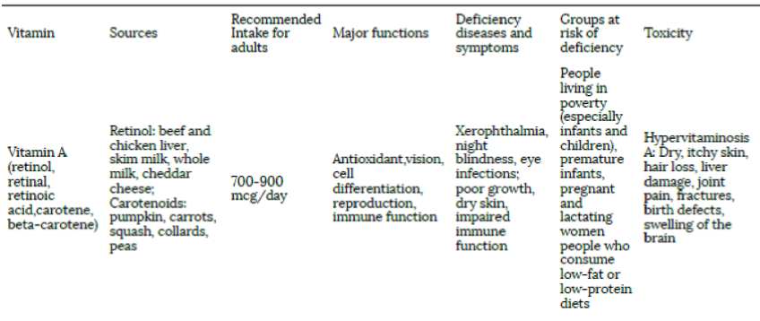 Vitamin A table: sources (7), deficiency symptoms (4), groups at risk of deficiency (3), toxicity (7)