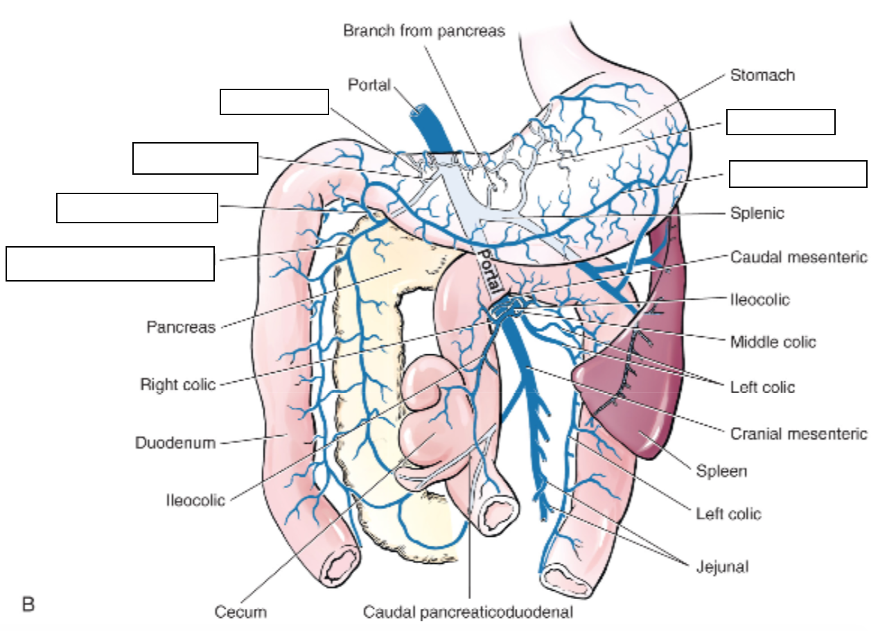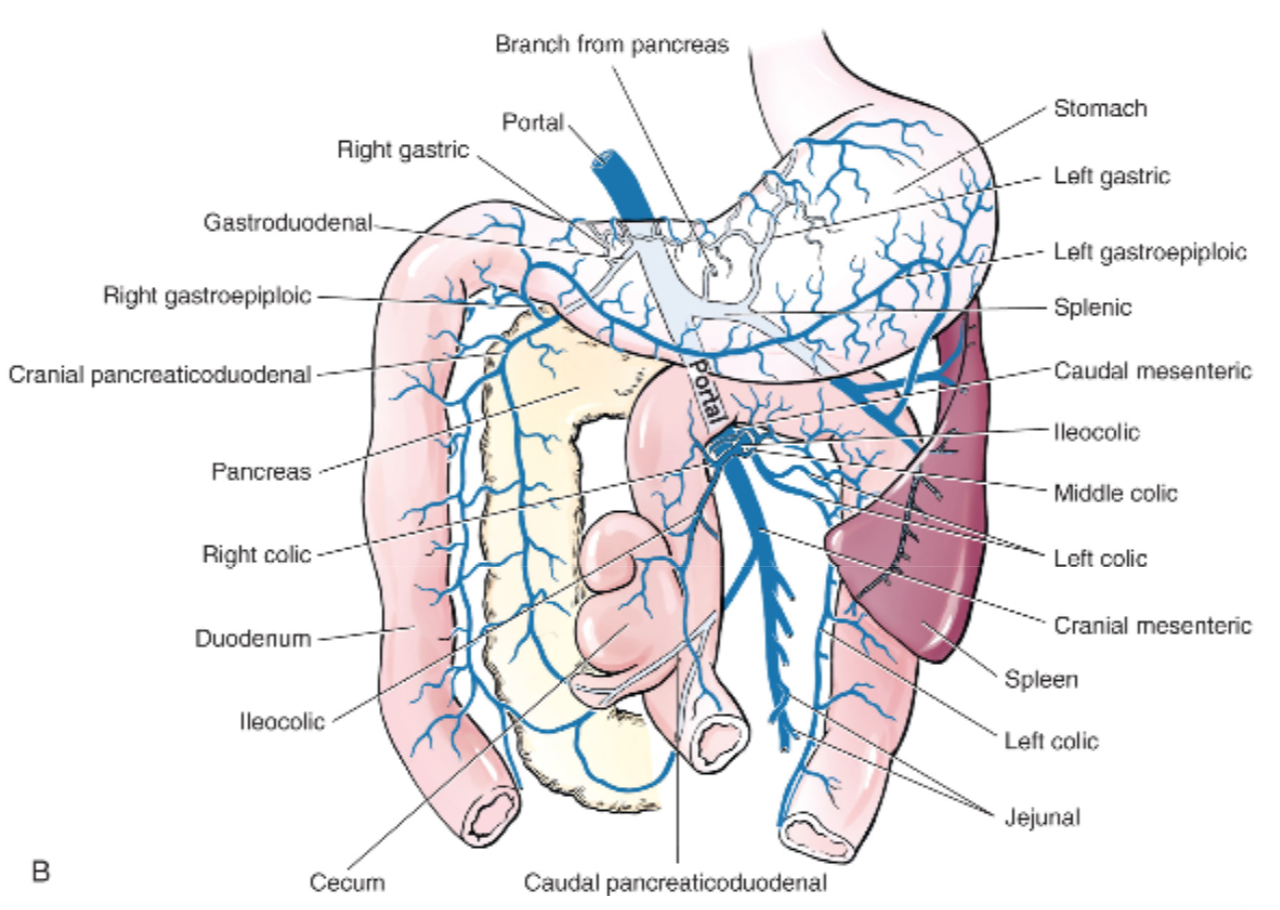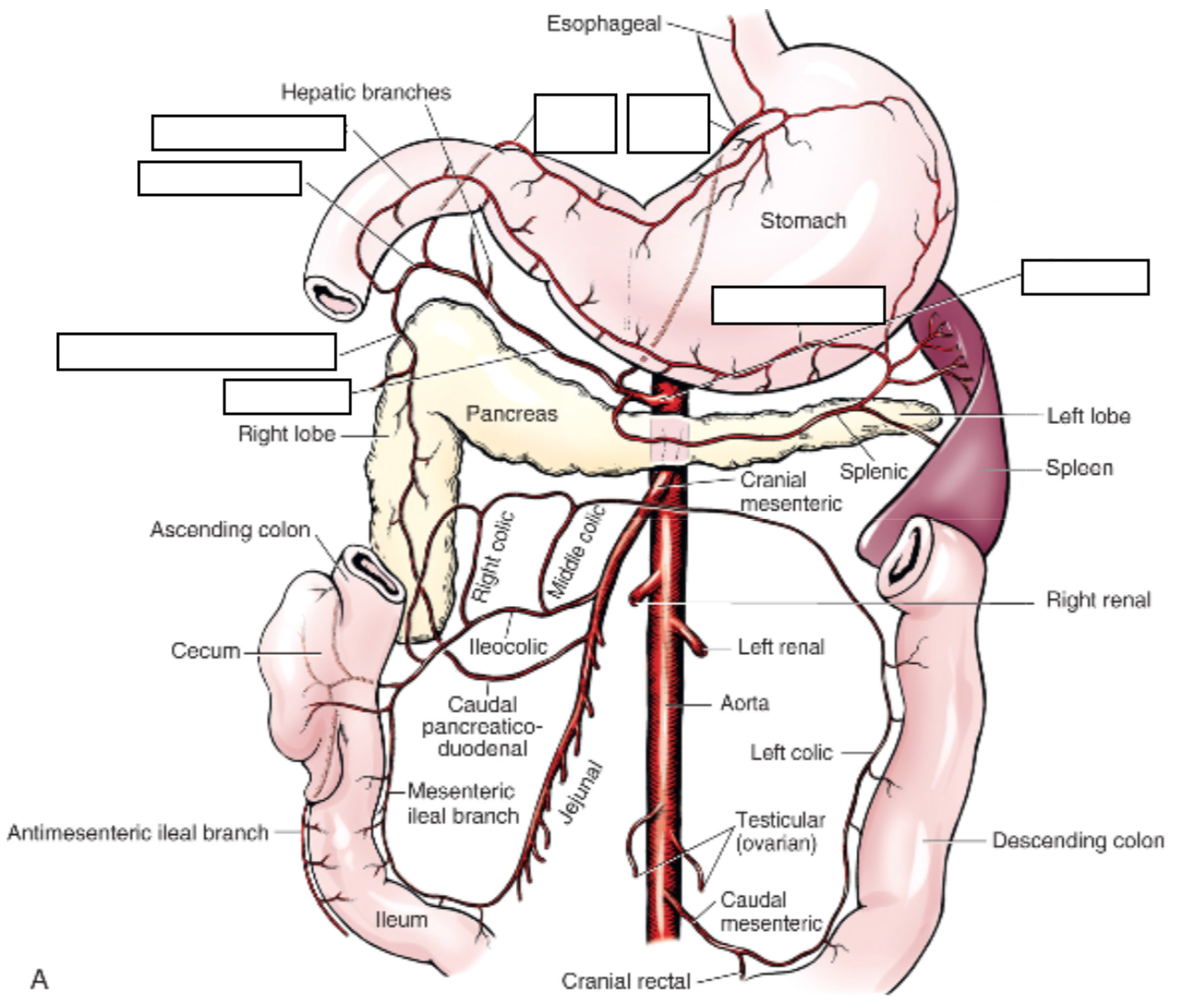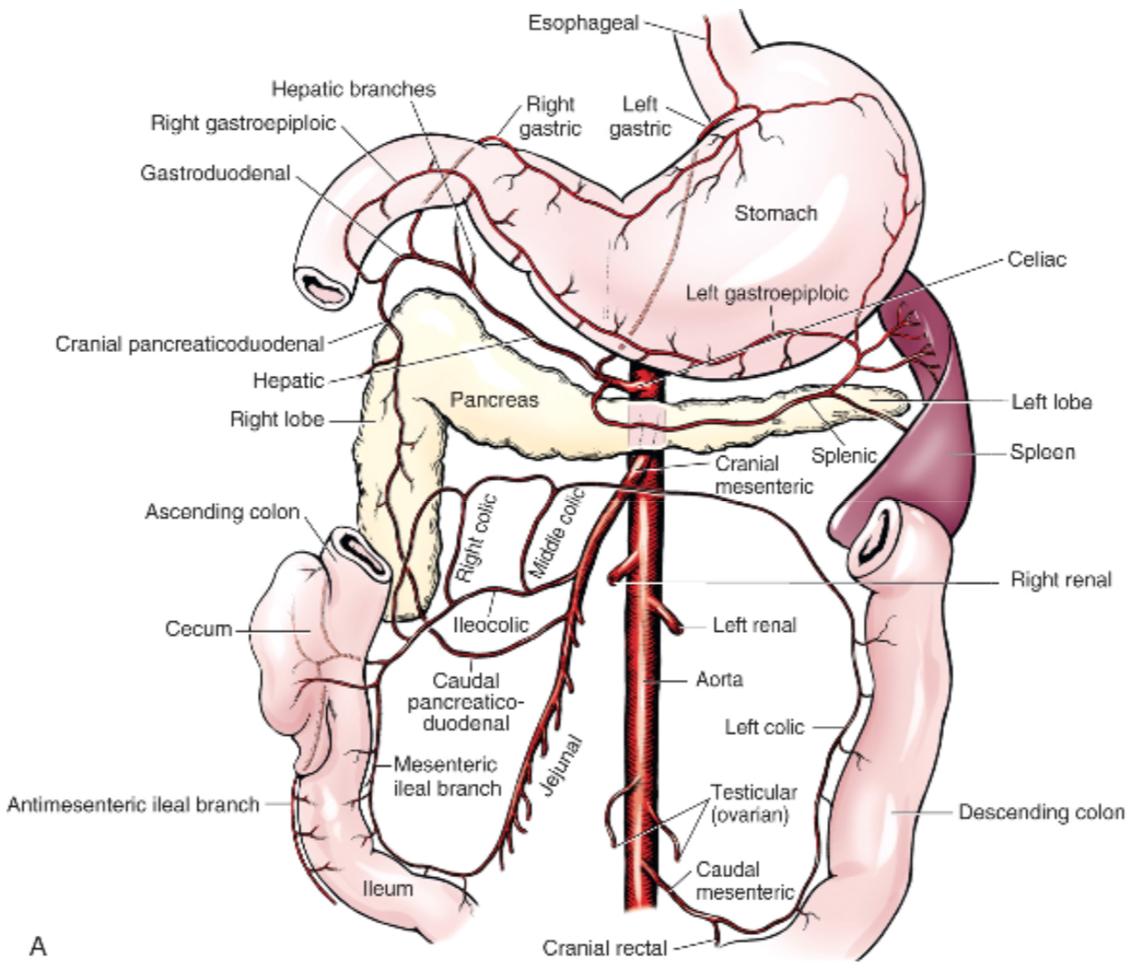 –> gives off right gastroepiploic + becomes cranial pancreaticoduodenal