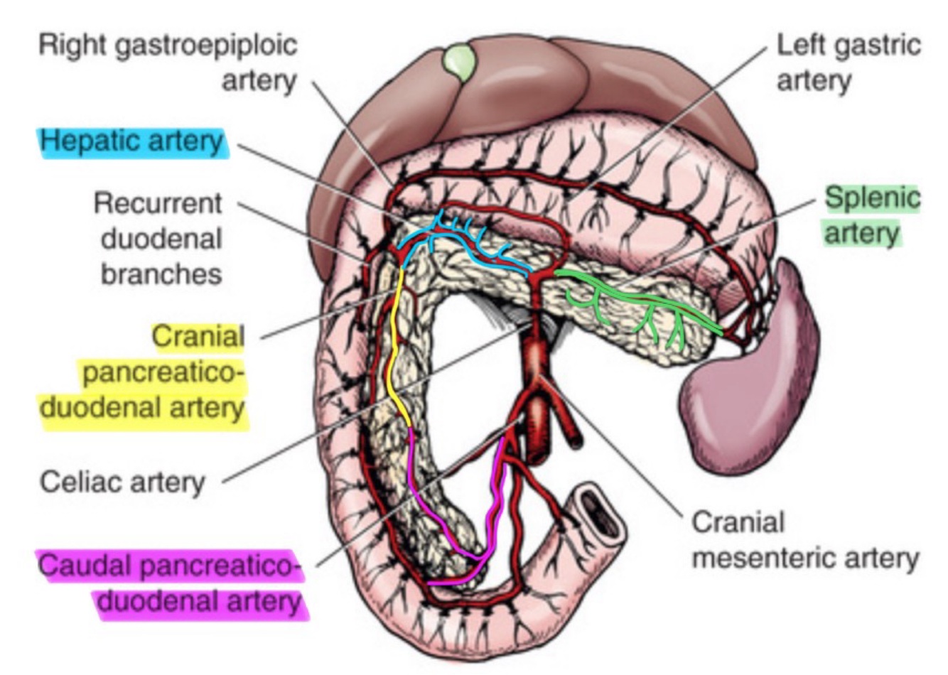 Caudal pancreaticoduodenal artery – supplies distal right limb of the pancreas