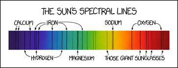 Dark lines in the spectrum of sunlight caused by missing colours.