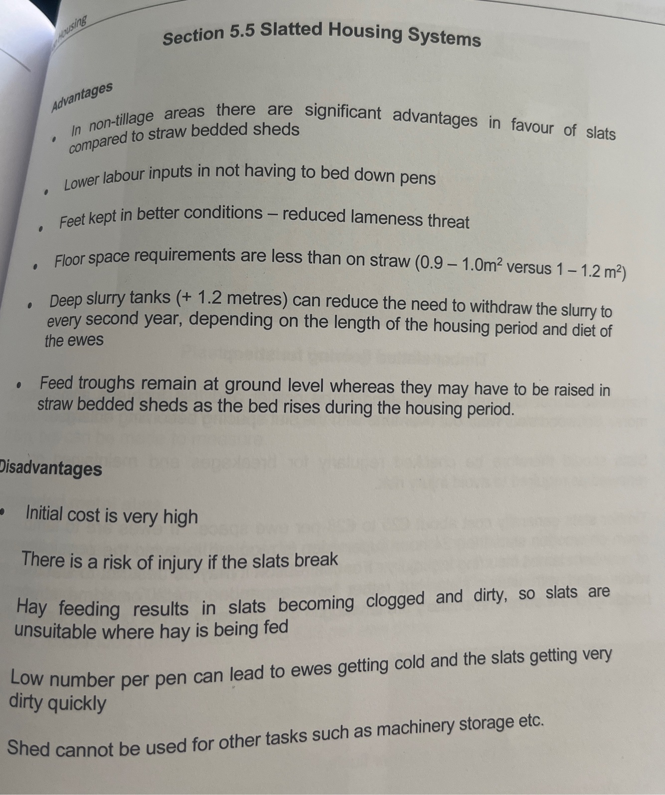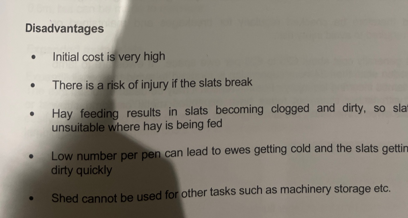 Give 3 disadvantages to slatted housing in sheep sheds